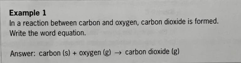 In chapter 1 you summarised a phase transition in a diagram. The evaporation of water, for example, can be given as: water () → water (g). If you do that for a chemical reaction, this is called a word equation. A word equation shows the reactants to the left of the arrow and the reaction products to the right of the arrow. After each substance, the phase of that substance (solid, liquid or gas) is indicated in abbreviated form.